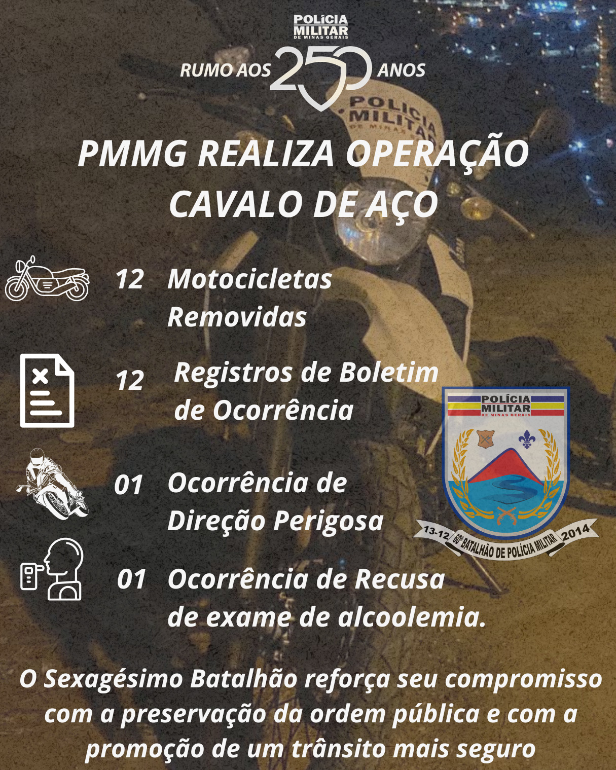 Neste último domingo, 11 de maio de 2025, a Polícia Militar de Minas Gerais, por meio do Grupo Especializado em Policiamento com Motocicletas (GEPMOR) e da 68ª Companhia Tático Móvel do 60º BPM, realizou a Operação Cavalo de Aço com o objetivo de prevenir delitos, coibir a prática de direção perigosa e ampliar a sensação de segurança junto à comunidade.
