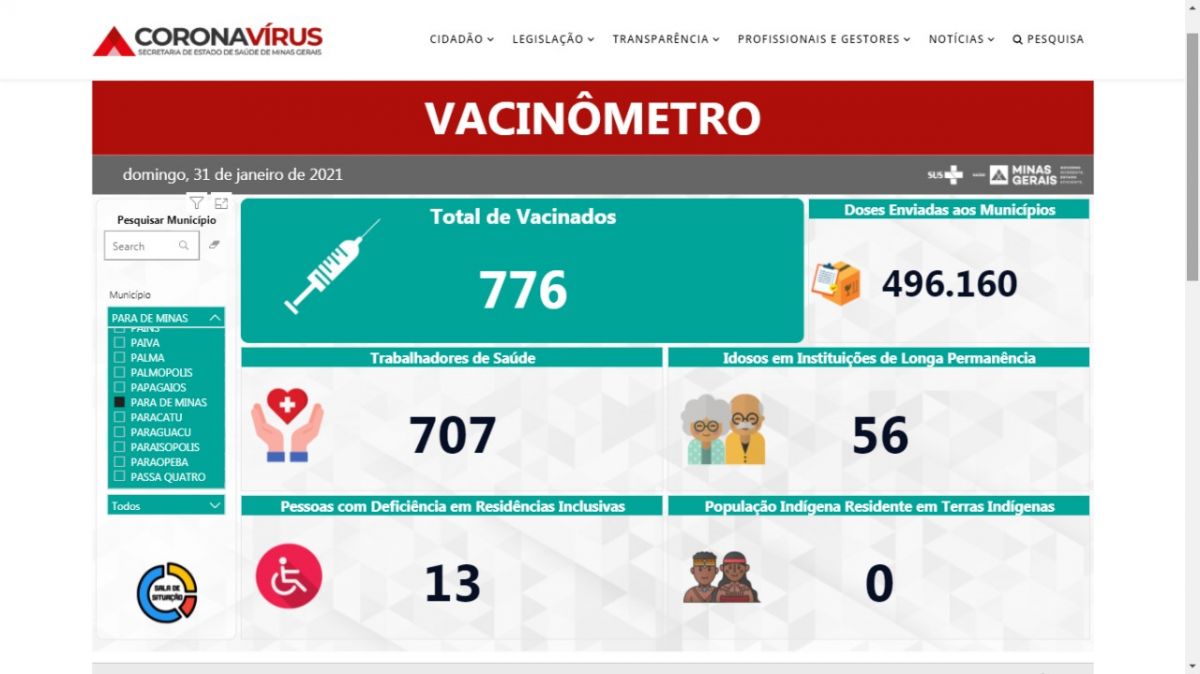 Vacinômetro / Pará de Minas (fonte: site do Governo do Estado de Minas Gerais)