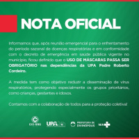 A UPA 24h Padre Roberto Cordeiro Martins, em reunião realizada com representantes da Prefeitura Municipal de Divinópolis, incluindo a Vice-Prefeita Sra. Janete Aparecida, a Secretária Municipal de Saúde Sra. Sheila Savino, a responsável pela Atenção Primária Sra. Simone Zanardi, o responsável pela Atenção Especializada Sr. Geraldo Almeida, o Secretário Executivo do CIS-URG Oeste Sr. José Márcio Zanardi, e o Diretor Técnico da Unidade Dr. Marco Antônio Expedito de Oliveira, deliberou pela adoção de medida emergencial de contenção do surto de doenças respiratórias.