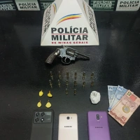 Durante as buscas, os militares apreenderam um revólver calibre .32 da marca Taurus com 14 munições, quatro papelotes e uma porção maior de substância semelhante à cocaína, três celulares e R$15 em dinheiro.