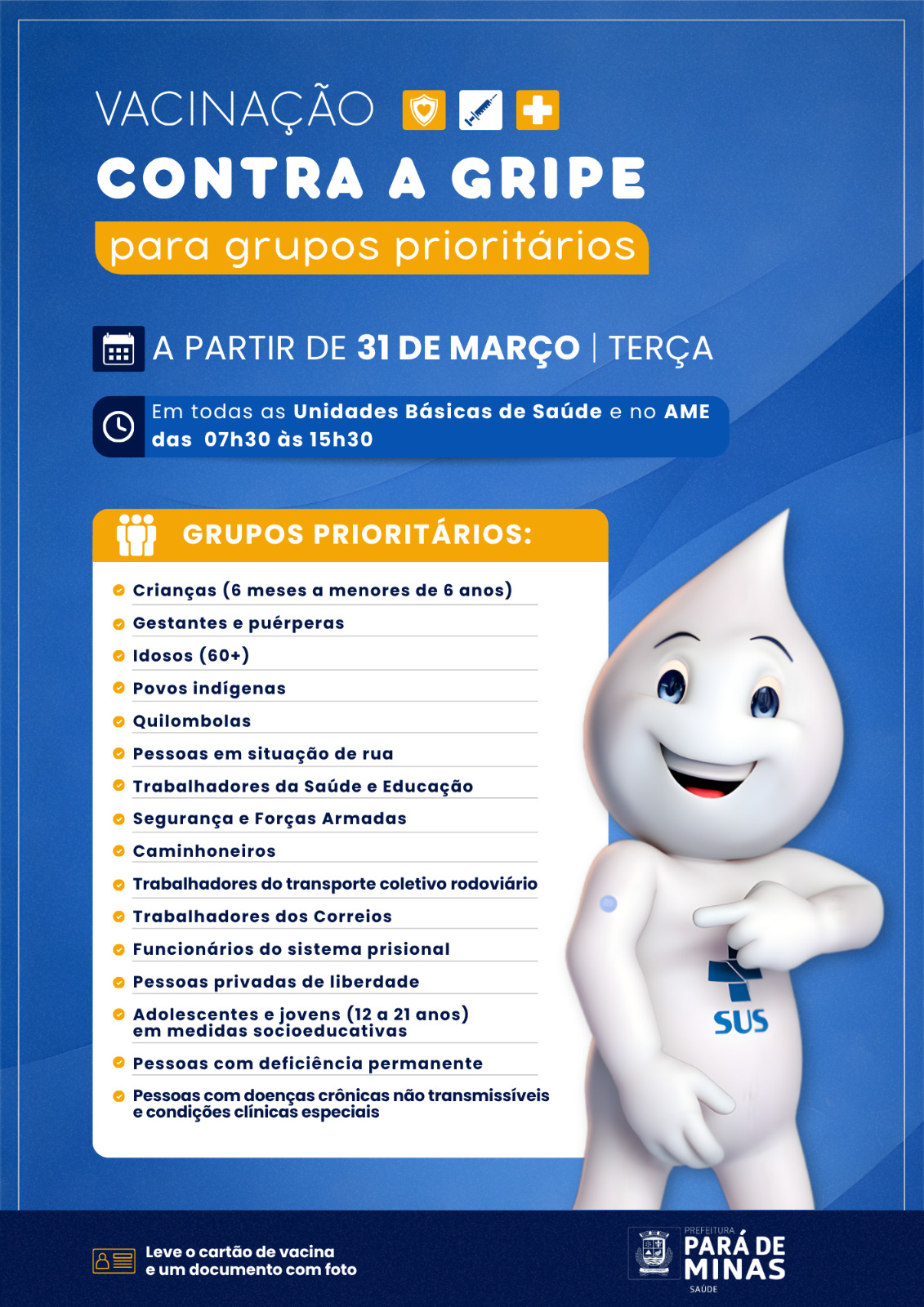 A cidade de Pará de Minas promove, neste sábado (11), o Dia D da campanha de vacinação contra a gripe, com foco nos grupos prioritários. A ação será coordenada pela Secretaria Municipal de Saúde e contará com seis pontos de imunização distribuídos pelo município.